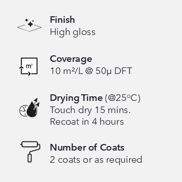 A high-quality modified alkyd resin-based enamel with outstanding high gloss finish. Its fast drying, non-yellowing, weather and heat resistance (up to 250°C) characteristics makes it an ideal finish coat for industrial equipment and any steel structures in marine environments. Colofast also comes in a semi-gloss and matt finishes.